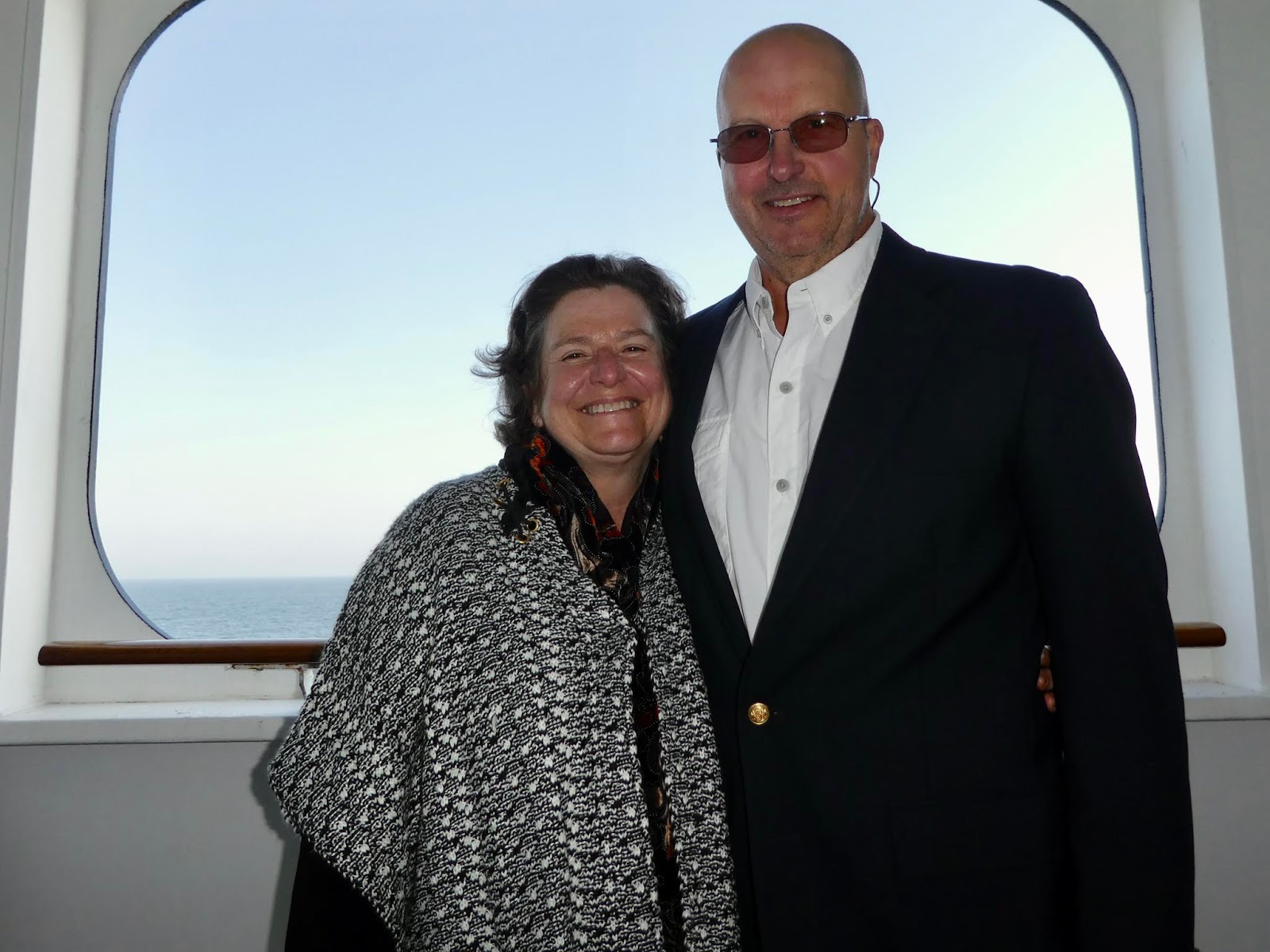 It was a foggy, cool, evening, but many gathered on deck for the departure.  George and I enjoyed our first beer on board.