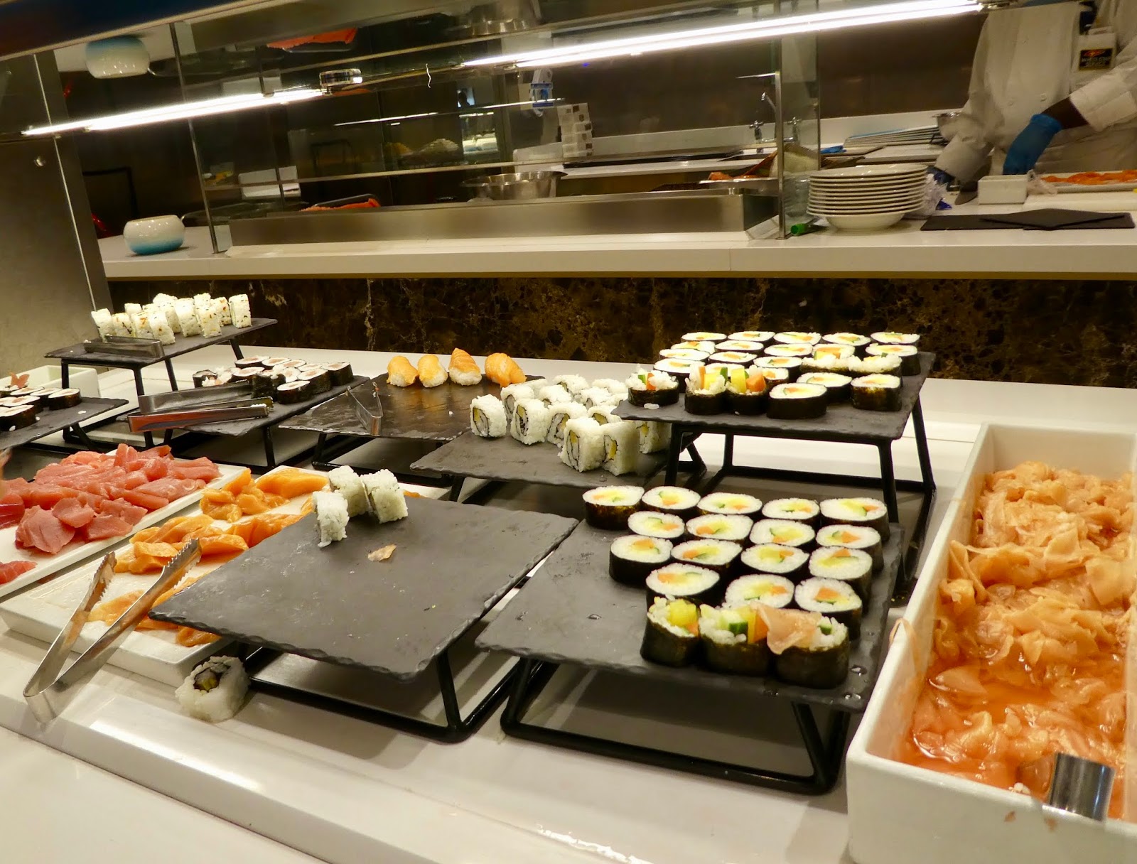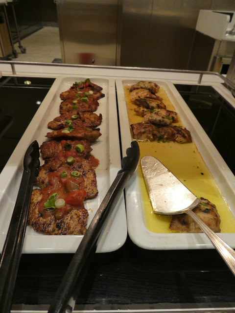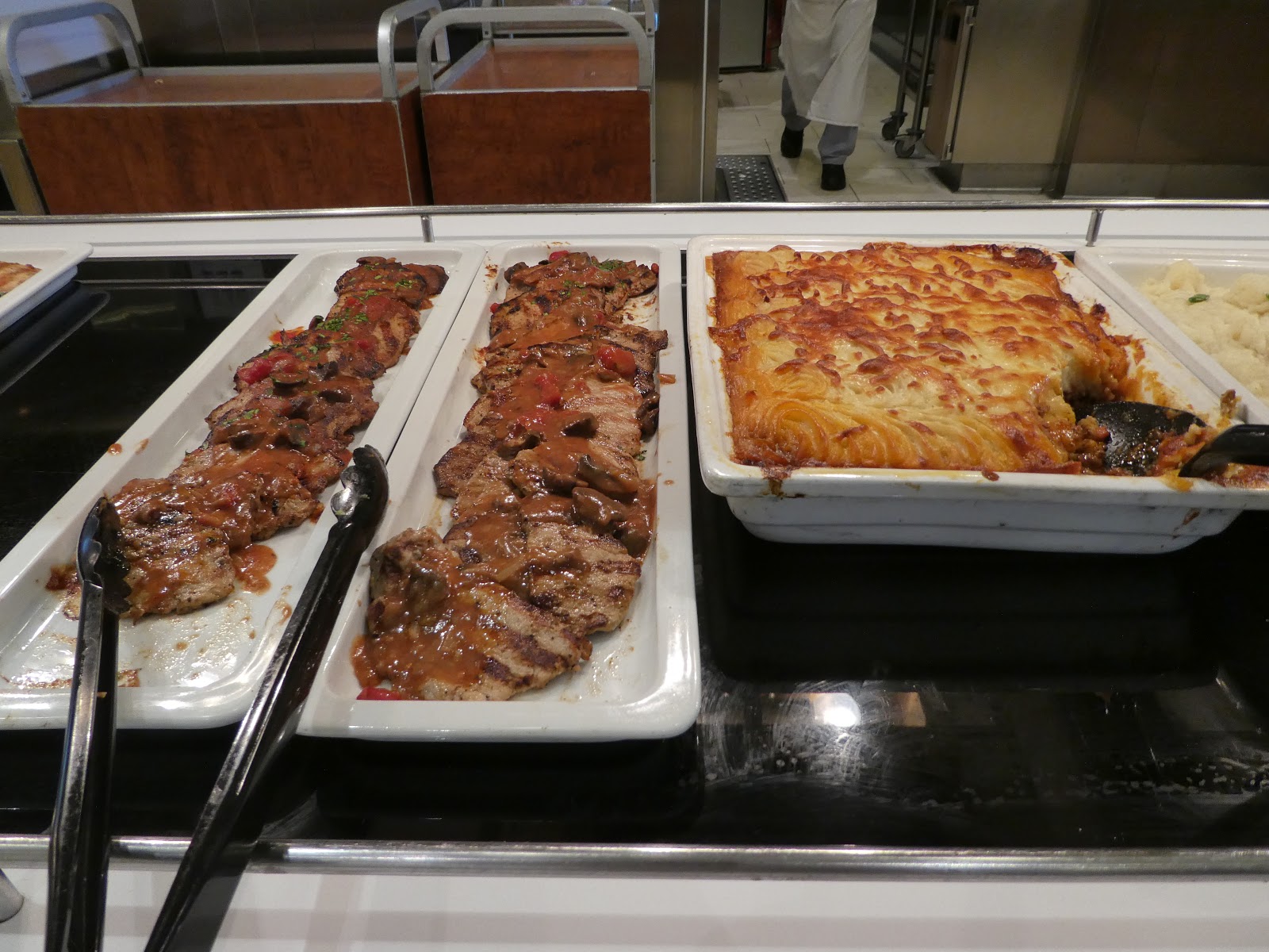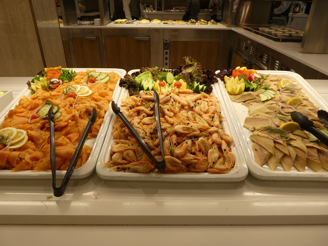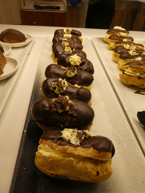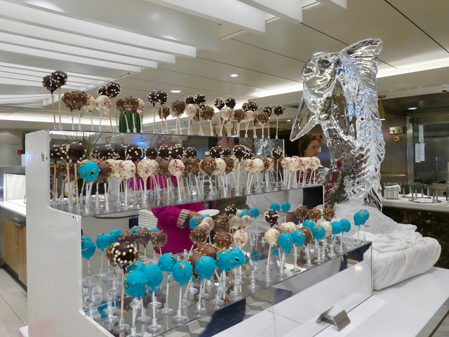 There is a large self-serve dining area (The King’s Court) that is open nearly around the clock offering breakfast, lunch, dinner, as well as, endless confections.  High and low tables for two, four, and larger groups are set with placemats, linen napkins and silverware.  The food in this court is also different every day and very good.  For example, we have feasted on exquisite rack of lamb, shrimp dishes, sushi, roasted vegetables, salads, fresh and smoked fish, and stir fry.