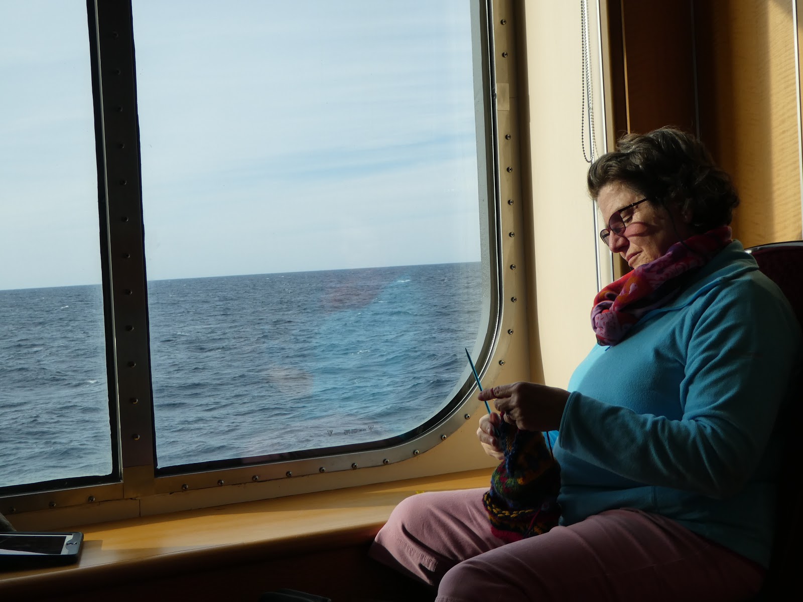 The seas have been relatively calm with only one day when the swell grew to 8 or 9 feet.  Most often, we can barely detect the boat rocking.  There have been several days of winds that, combined with the 20+ knot speed of the boat, could nearly knock you off your feet.  Temperatures have ranged from the high 30’s to the 60’s with variable degrees of sun and clouds.  We have, on occasion, found warm sheltered areas to sit outside, but we have spent most of our time within the ship.