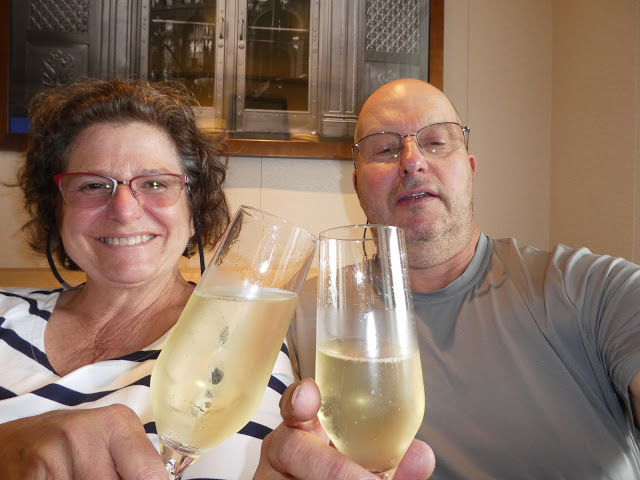 Enjoying a complimentary bottle of champaign in our stateroom on the day of our arrival