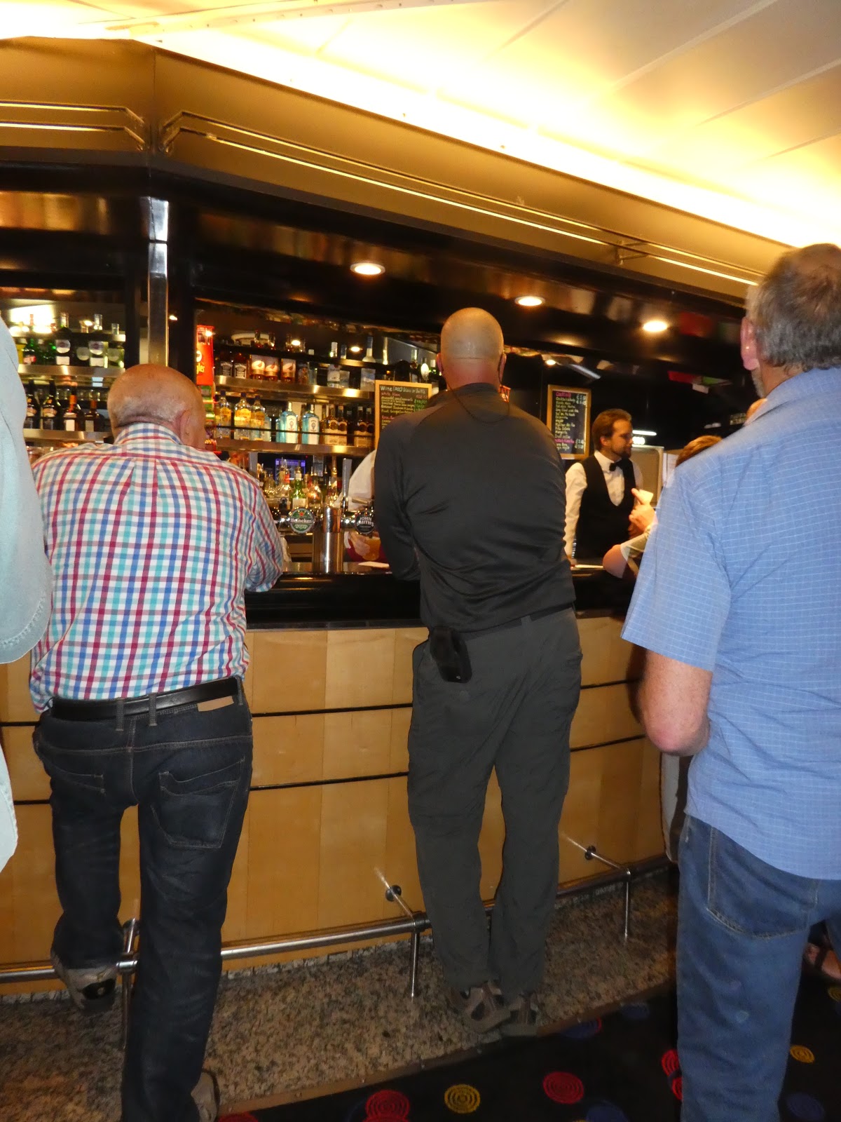 After all other passengers had boarded the ferry, these men and women helped us push our luggage carts and load the luggage into a bus (just for us).  They accompanied us to the Ferry dock, reloaded everything onto new luggage carts and assisted in pushing them up the 6 steep ramps where the ferry personnel transported it directly into a luggage storage area.  We only needed to bring our overnight necessities to our cabin and begin exploring the ferry.  First stop, a bar with some nice, cold, beer on tap.