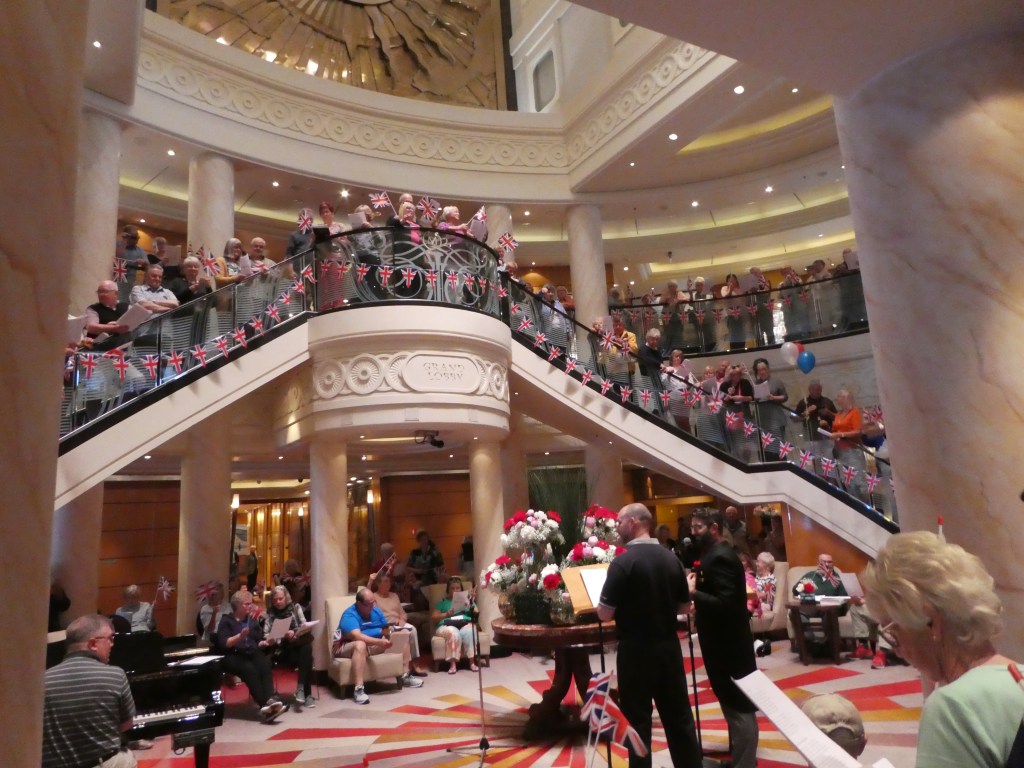 Shortly into our voyage the occasion of the royal wedding between Prince Harry and now Princess Meghan dominated events on the Queen Mary.  The ship’s Royal Theater opened at 6:00am and broadcast live coverage of wedding preparations, the event itself, and commentary afterward.  British pride and nationalism was in evidence everywhere.  The ship and many passengers were decorated in British red, white and blue.  The British Royal Regalia (a group sing along) was held in the Grand Lobby that concluded with the British national anthem.