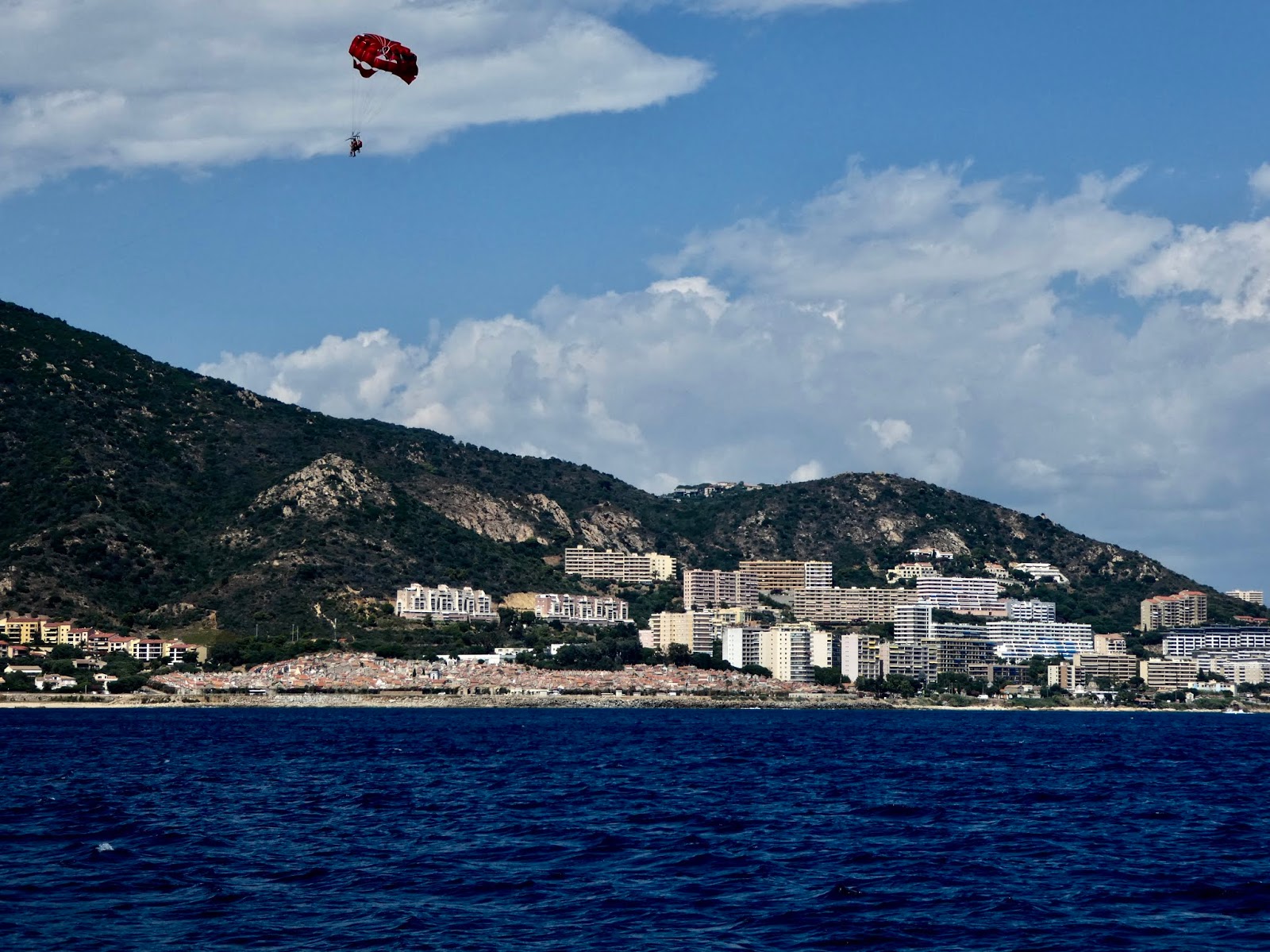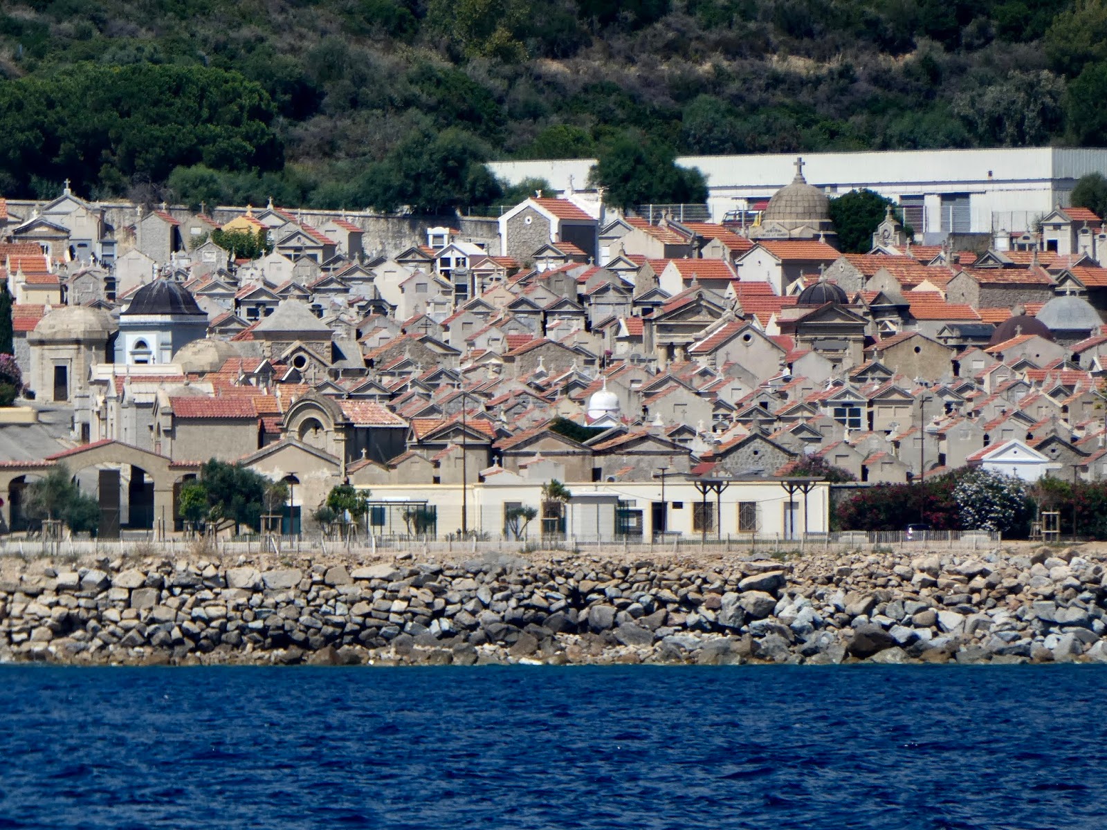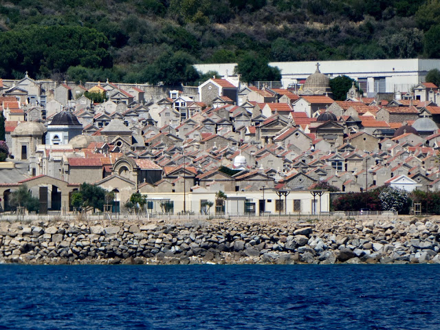 | On the approach to Ajaccio we passed by someone behind a parachute boat who photo-bombed my shot of a large cemetery right off the water (seen in closeup, below). |