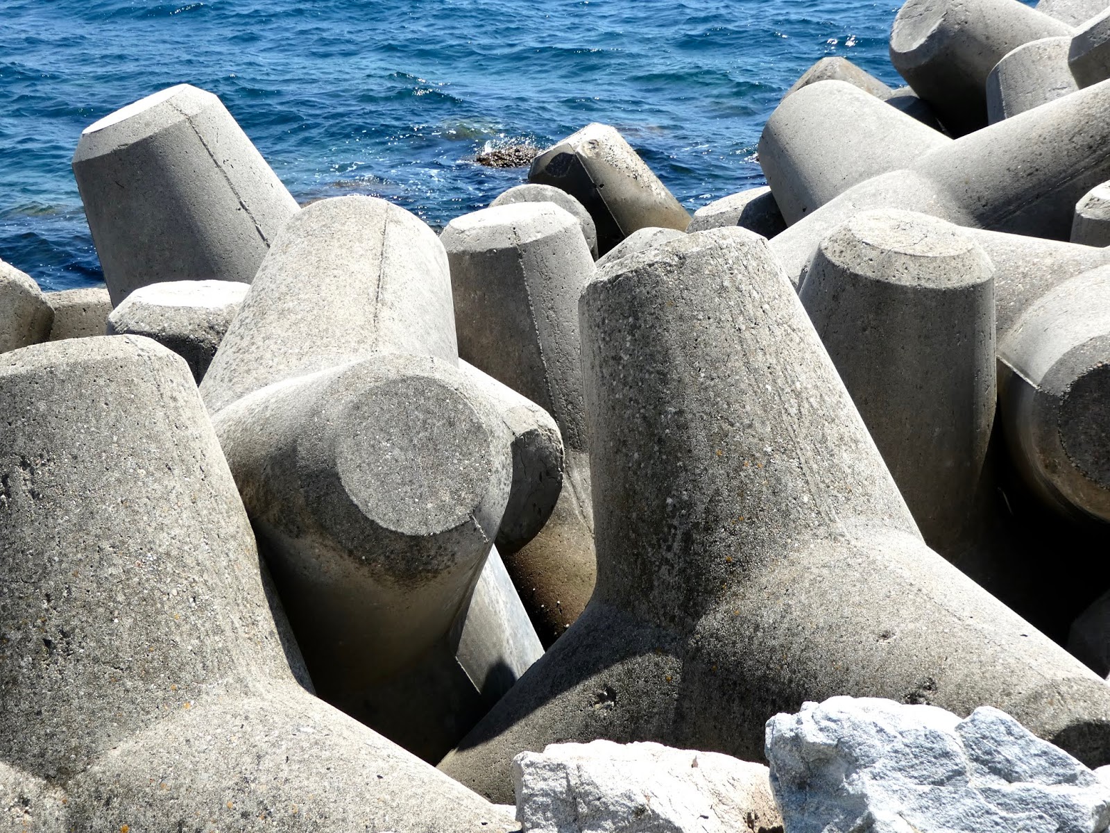 | The jetty has been fortified by large concrete jacks that nestle together |