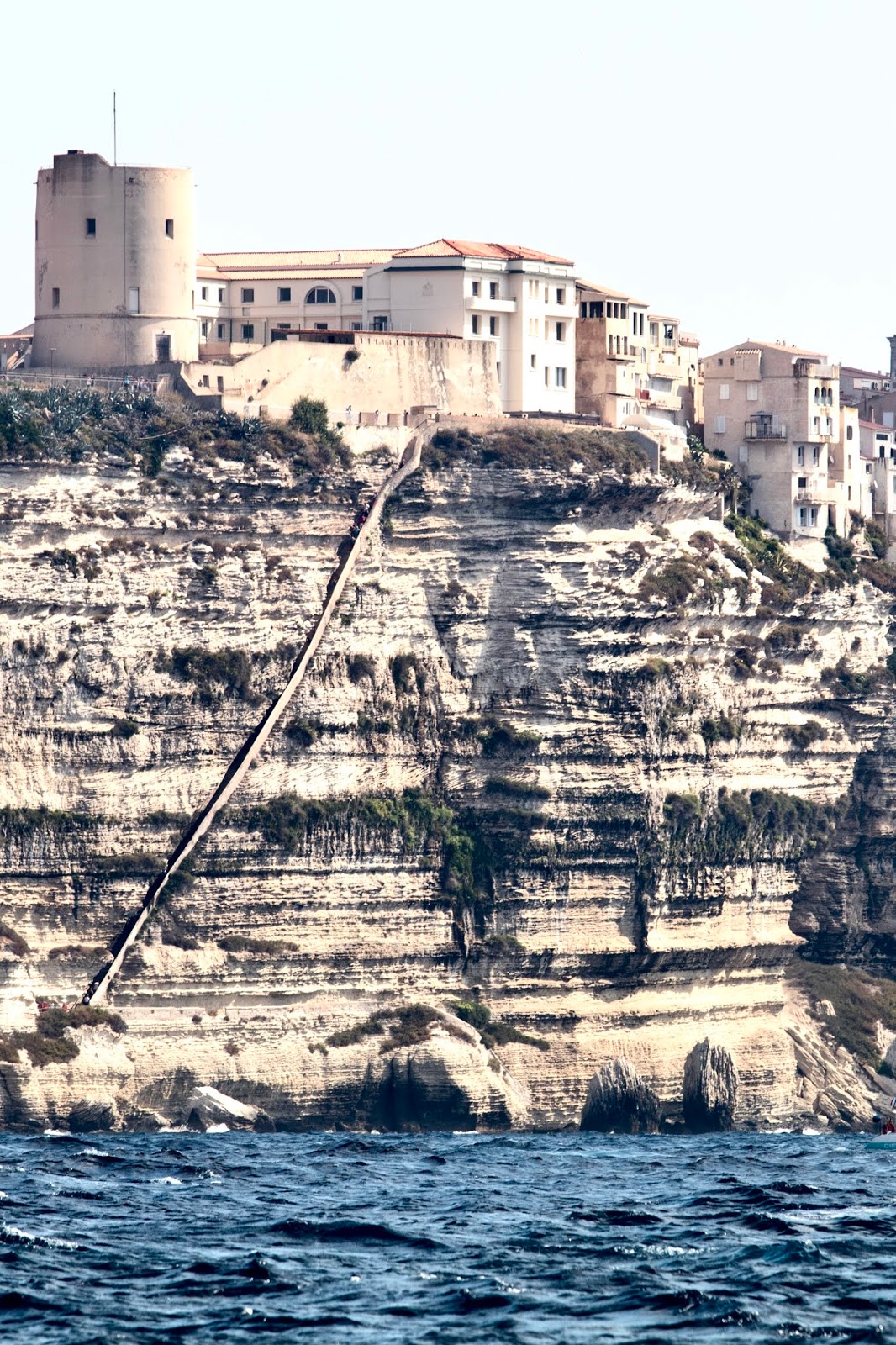 The Citadel and Old town of Bonifacio were built in the 9th century on the top of white, limestone, cliffs which are about 230 feet above sea level. Legend has it that a staircase, named the Staircase of Aragon, was hand-carved out of the limestone in a single night by soldiers of King Aragon during a siege in 1420. However, it is widely believed that it was carved out by Franciscan monks long before King Aragon’s reign. The staircase leads to a spring with fresh water.
