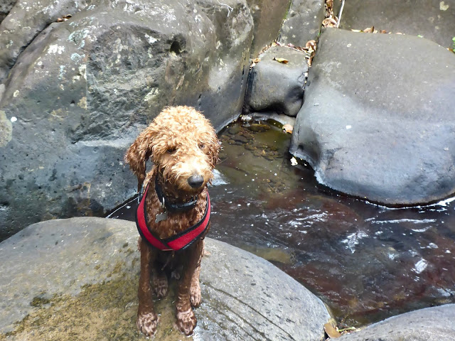 Let me start by concluding that we enjoyed the hike very much. It was indeed shady, and we scrambled up and down many, many, many boulders, but we were decidedly not “cool”. I venture we sweat a half gallon each. There is considerable overall elevation to the hike as the river flows from the top of a small mountain (large hill just doesn’t quite describe it). We found it to be a very strenuous hike and Duhkxy agreed!!!