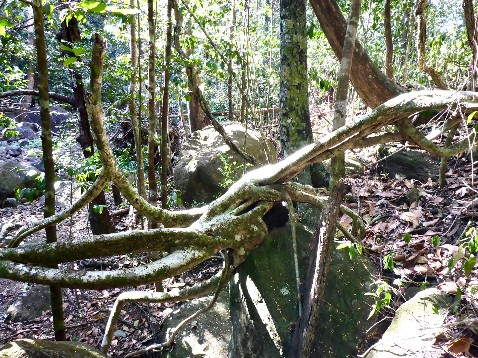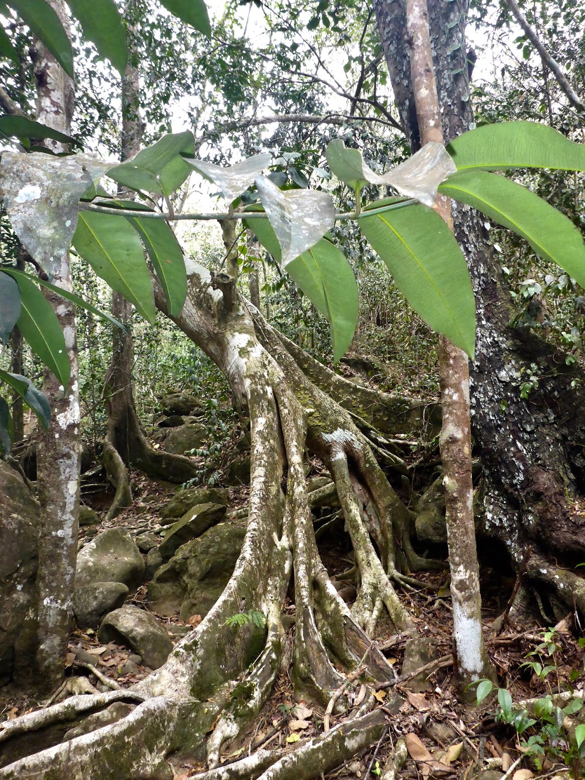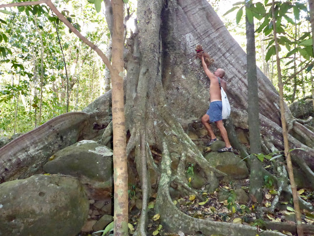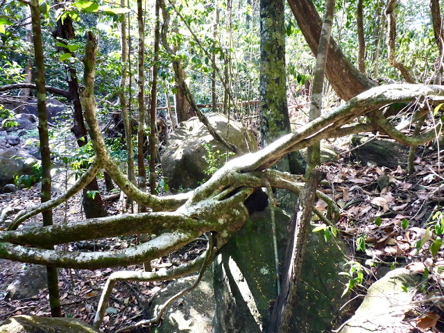 We marveled at the unusual way some trees grow in the tropics. We hypothesized their growth habits evolved in a world that never saw a freeze or snow. When encountering an obstacle, a limb may snake around it. It is sometimes hard to distinguish a limb from a root. Trees thrive growing on top of rocks or with three quarters of their roots undermined.