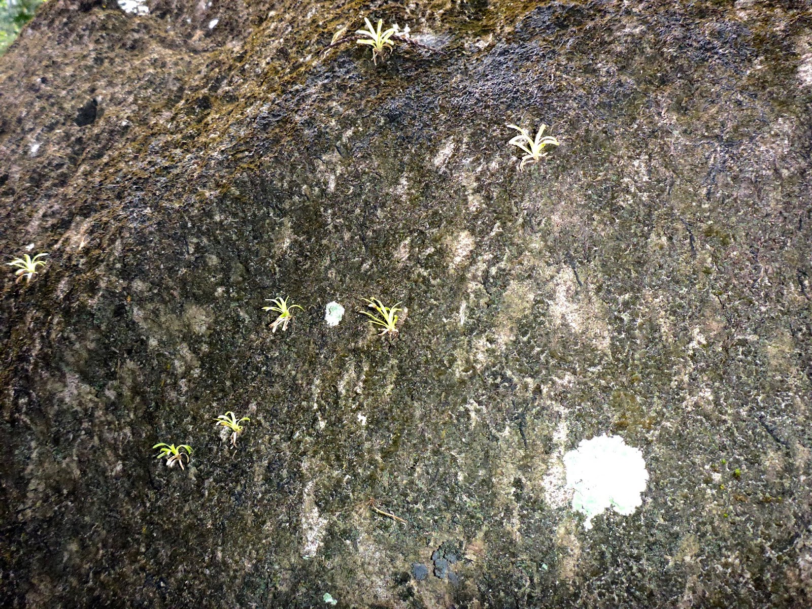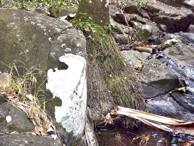 | Massive exposed root base of palm forging its way through the rocks to the water and nutrients it requires. On left, a massive white lichen. |
