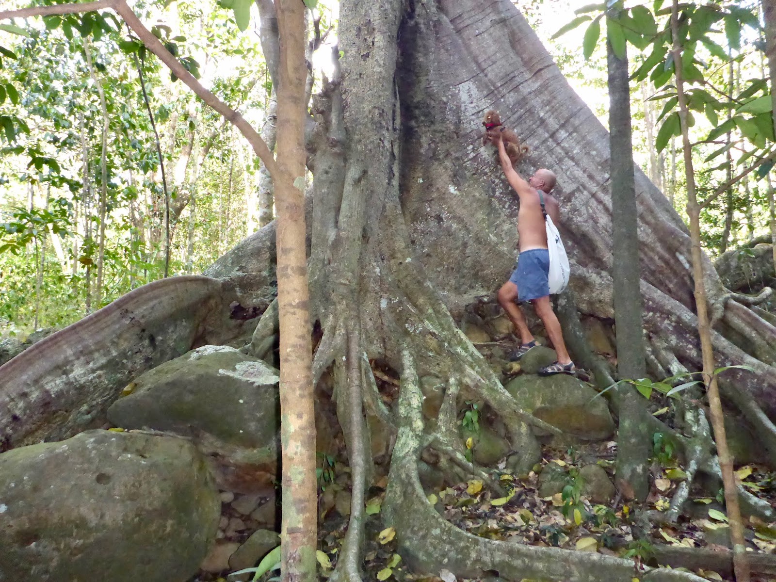 | George holds up Duhkxy so you have a reference for how big this ceiba tree is |