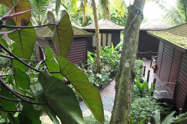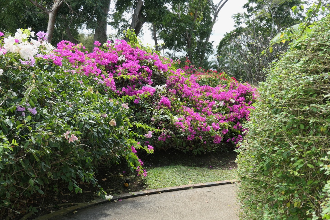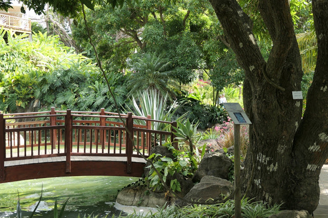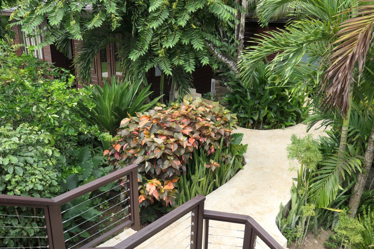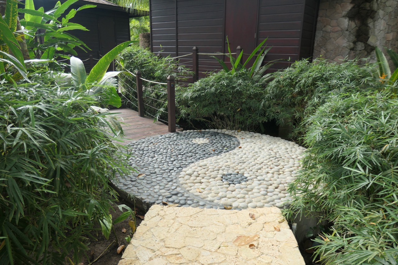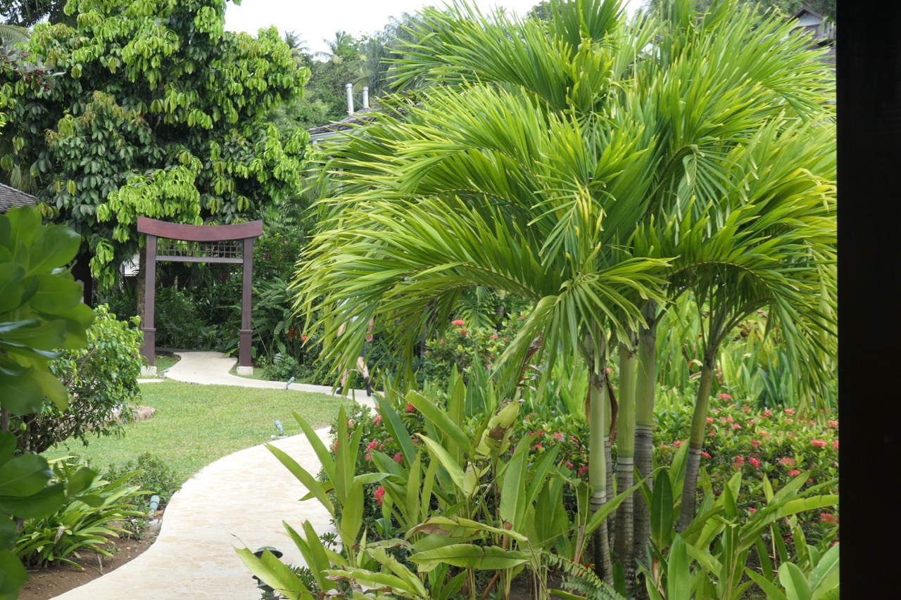 The winding paths through the resort are bordered by beautifully designed and maintained gardens and buildings.
