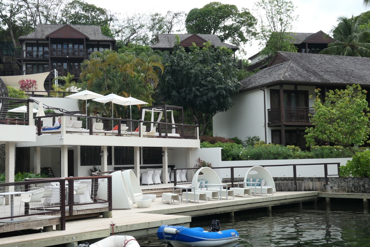 The Marigot Bay Marina and Resort is renowned for its beauty and accoutrements. Accommodations include 915 square foot Junior suites starting at $390 per night in the off season and go up from there. HOWEVER, a slip on the dock ran us ~$40 per night and came with full access to the resort facilities, pools, spa, gardens and restaurants. What a deal! It reminded us of our great fortune staying in a marina in the heart of Paris for only 40 euro a night. We wish all marinas were so reasonable.