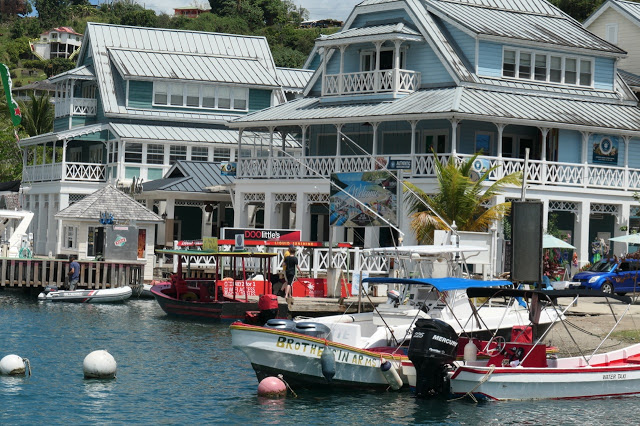 Further out, beyond the sand beach on the left the Marigot Beach Club is situated. The beach club offers day passes and longer rental accommodations, sets up outings such as kayaking, snorkeling, diving, et al. A beach-bar restaurant named DOOlittles offers local fare and a boat shuttles between the Marigot Beach Club and the Marigot Bay Marina and Resort, as well as many additional restaurants. A wedding was held at the Marigot Beach Club while we were visiting.