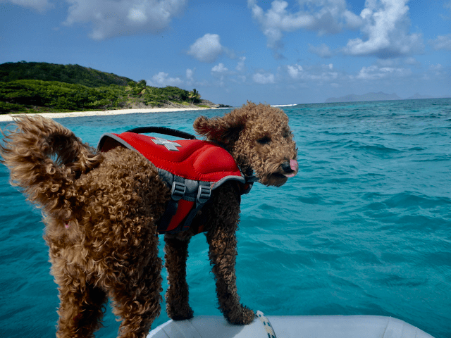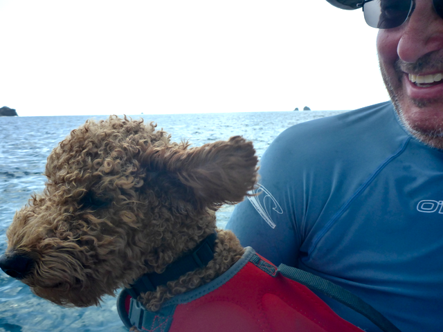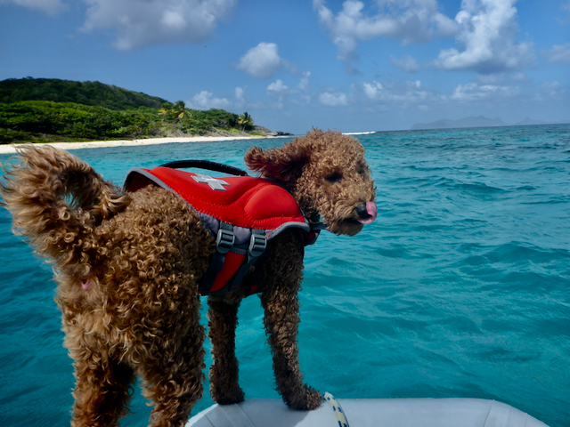 Best of all, he has learned to sit patiently in the dinghy when we snorkel.  Sometimes he needs one or two reminders.