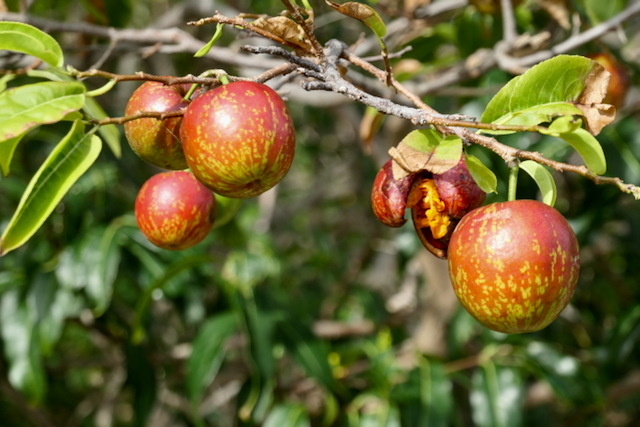 A great way to begin introducing yourself to edible Caribbean plants is to sample each wonderful fruit in season.  You still may need to make inquiries about what constitutes “ripe” and what part of the fruit is edible, but for this you need only inquire of the vendor.  You taste it in all its glory and you either like it or not.  We have been living on bananas, guavas, mangoes, jackfruit, sour sop, passion fruit, papaya, paw paw, starfruit, citrus, et al.  We have fresh fruit with nearly every meal and we enjoy rum smoothies with fruit we freeze in season.