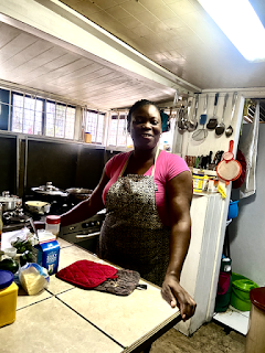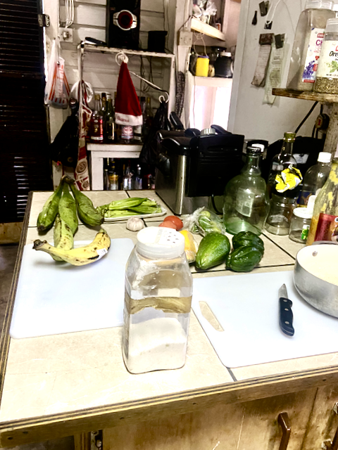 We would prepare a green banana salad, pumpkin, christophine (aka chayote) in a cheese sauce, and okra and tomatoes.  I thought “okra?” remembering my childhood experience, but with little concern as we had eaten it in the restaurant and it was delicious.  I asked Lisa and Sandra why the okra my mother prepared was so horribly slimy.  We learned that it must be cooked in the barest minimum of water (or battered and fried) to prevent this.  In addition, Sandra and Lisa answered questions about other vegetables and offered additional seasonings we should consider.