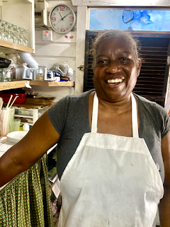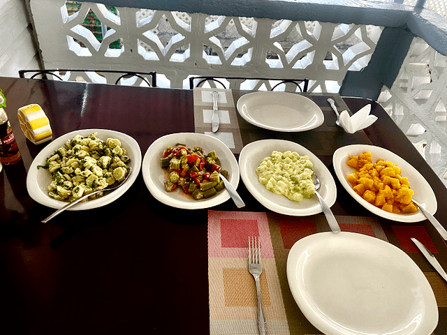 We have had some success preparing several new vegetables after we have enjoyed them in a restaurant, but this has hardly made a dent in those we have seen.  Most recently, we enjoyed a sampling of 20 to 30 (we lost count) small portions of a wide variety of vegetable and meat preparations at Patrick’s Restaurant in St. George’s, Grenada.  After finishing our last course, we commented to our server, Milton, that we needed to take some cooking lessons.  Much to our surprise, he said, “We can arrange that.”