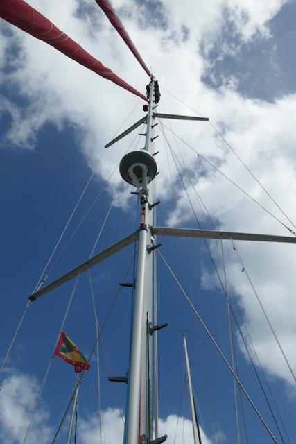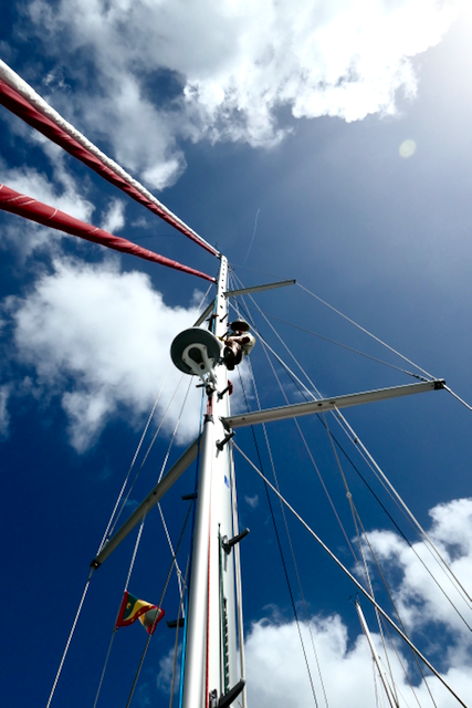George was assisted in untangling the line by intermittent squalls of heavy rain and gusts of 20+ knots of wind.  This, in the protected marina.  The squalls and swell had kept us docked there for several more days than we had intended – turns out, that was fortunate indeed.  Unfortunately, one end of the thin blue line got loose and tied itself around still another mast, port side to the catamaran.  We alerted them to the problem, fortunately in time as they were leaving the following day.  The captain of this sailboat thanked us several times, remarking what a costly and inconvenient outcome would have resulted if he had not known.