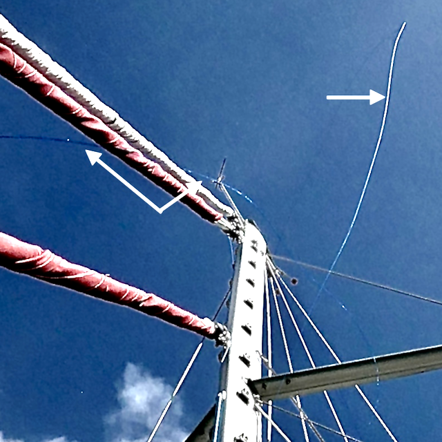 The younger of the two heroines in this story said “Do you know….” and pointed up to the sky.  I thought perhaps some interesting water birds were perching somewhere on the mast.  After taking a look, I was at a loss as to what they were trying to bring to our attention.  The older heroine chimed in that there was string – just as George spotted the thin blue line(s) of string that were attached to the top our mast.  It appeared that two lines of this string originated from the top of the mast of a catamaran on the opposite side of the dock from Ice Floe and then became tangled around the top of our mast.
