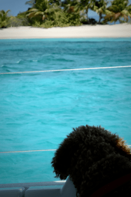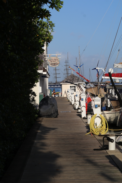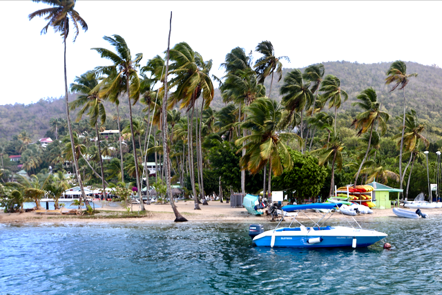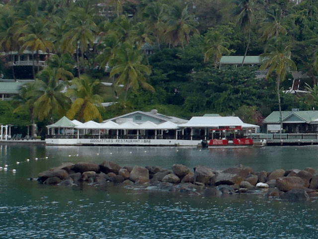 We took the ferry over to the small beach near Doolittle’s and spent the afternoon swimming, shelling, and playing with Duhkxy. This beach is shared by several resorts and has lounge chairs designated for guests of the Marigot Bay Resort / Marina. You can peruse tabletop displays of shells and other memorabilia and there are a number of informal shops that sell souvenirs, beverages, and snacks. For something more substantial, Doolitle’s is just a 2 minute walk away.