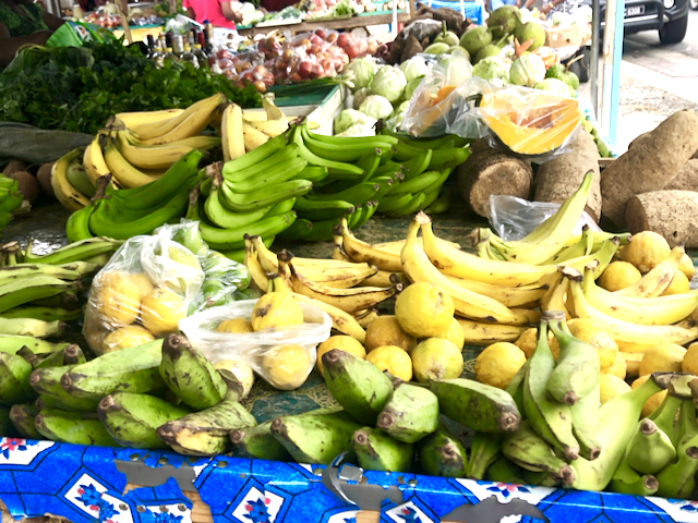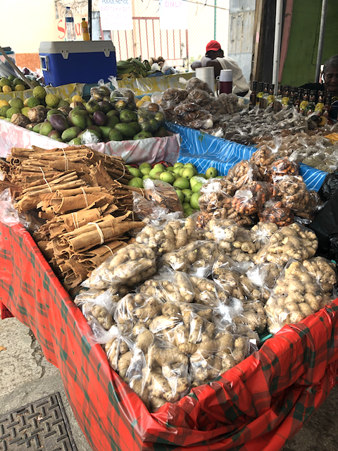 The current market that we visited had separate sections for fruit / vegetables and souvenirs / clothing / et al. The produce vendors displayed virtually every edible plant in season. As we observed in other Caribbean islands, as well as in Europe, produce was exclusively local. People eat primarily in season here, although we do find imported produce like raspberries, apples, and pears in the larger supermarkets.