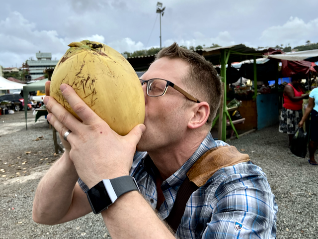 Tristan had a wish list of things he wanted to do in St. Lucia. One was to drink from a coconut. He got his chance at the Castries market. His Dad (below) shows him how!