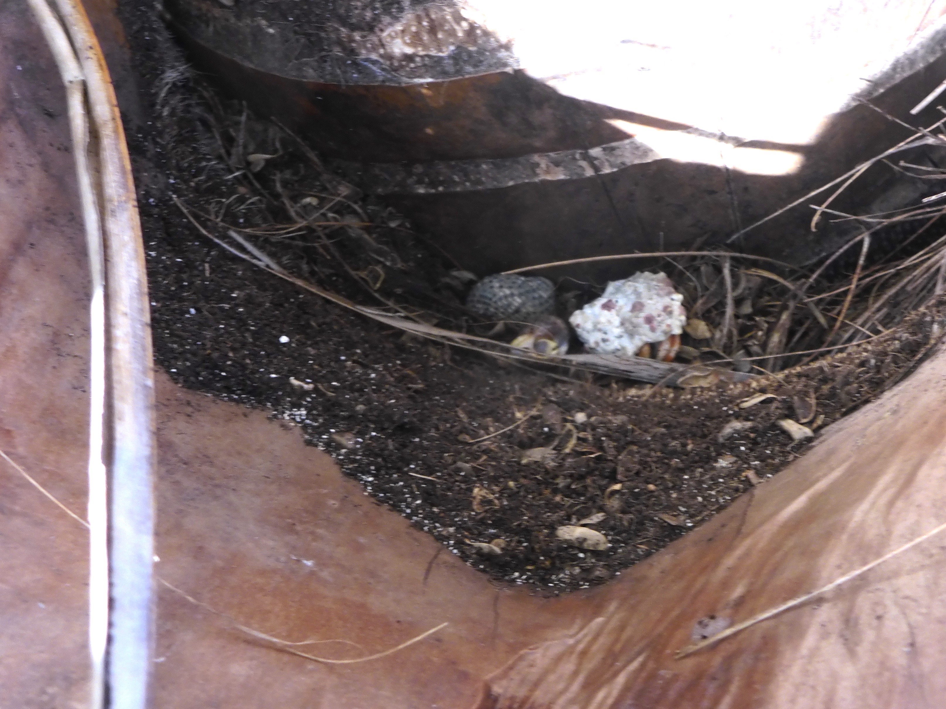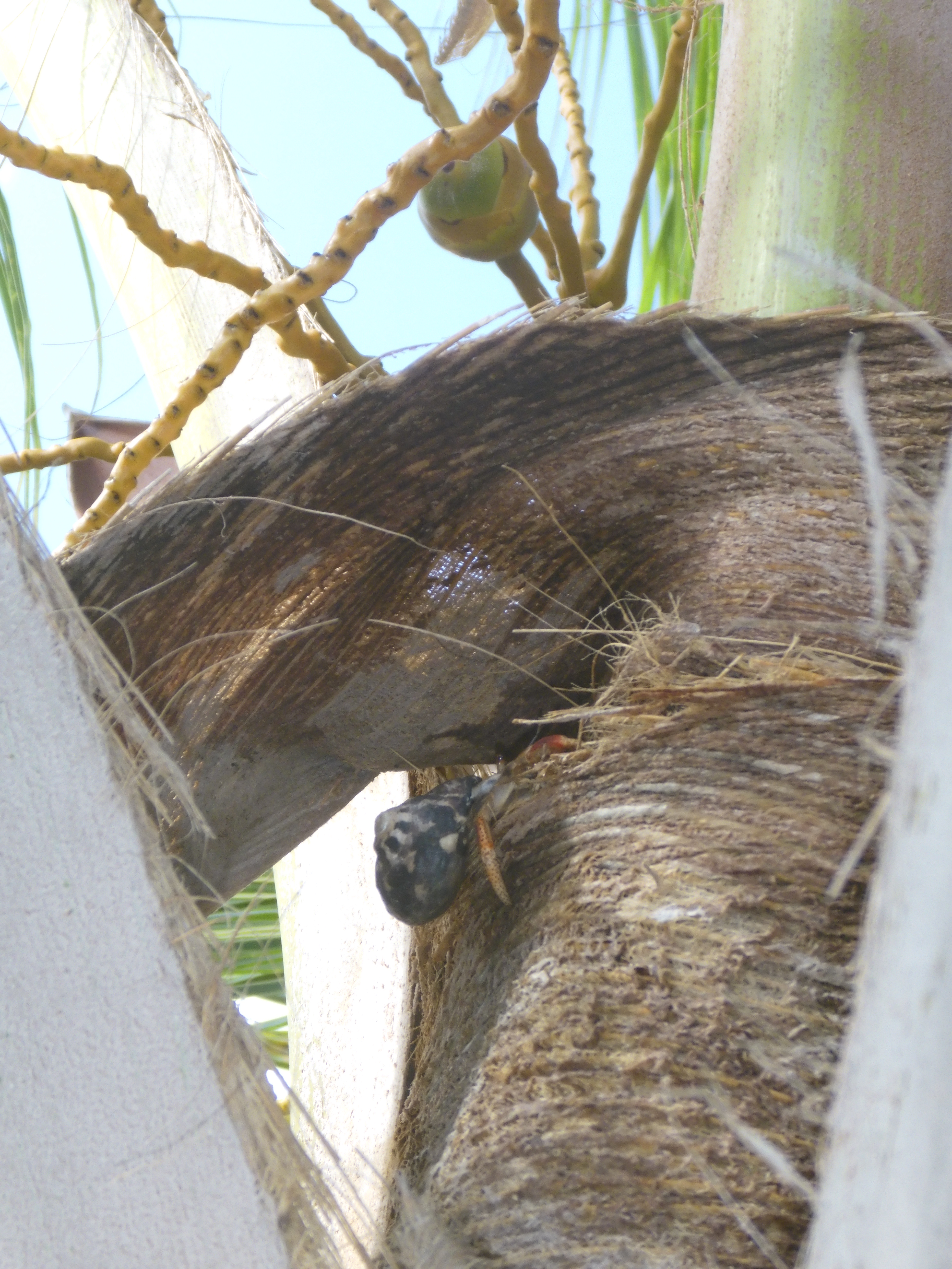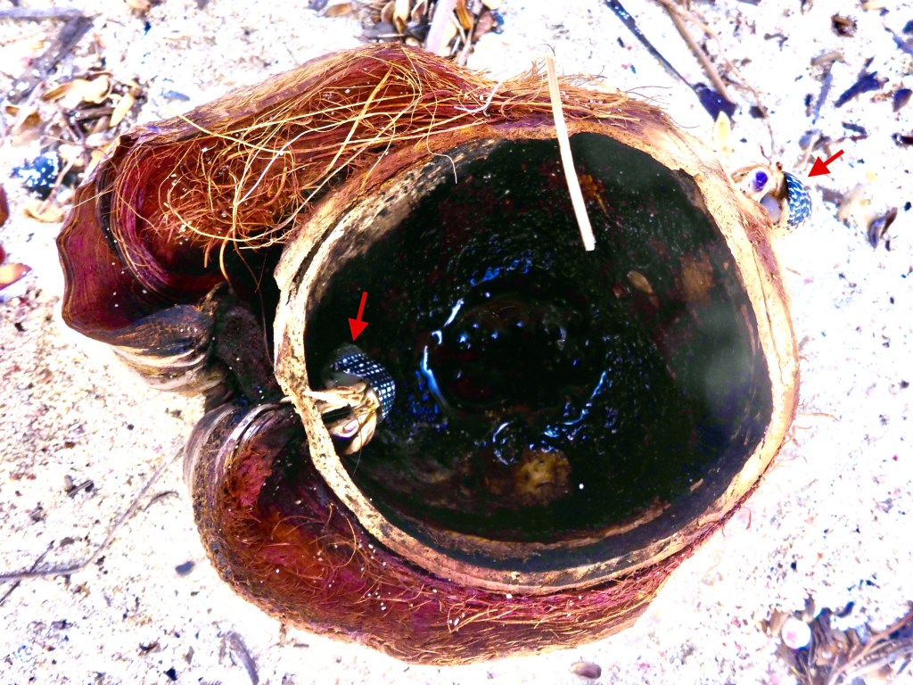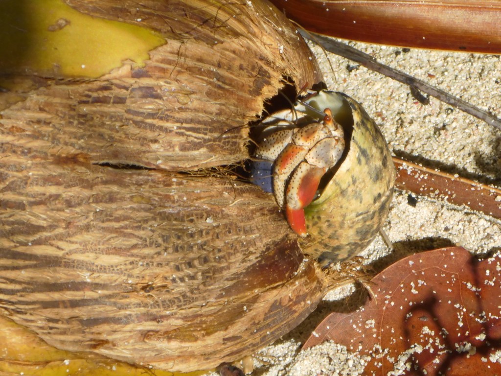 We were fairly certain the crabs must drill and eat out the coconuts while they were still on the tree. We went in search of hermit crabs eating coconuts up in the trees.