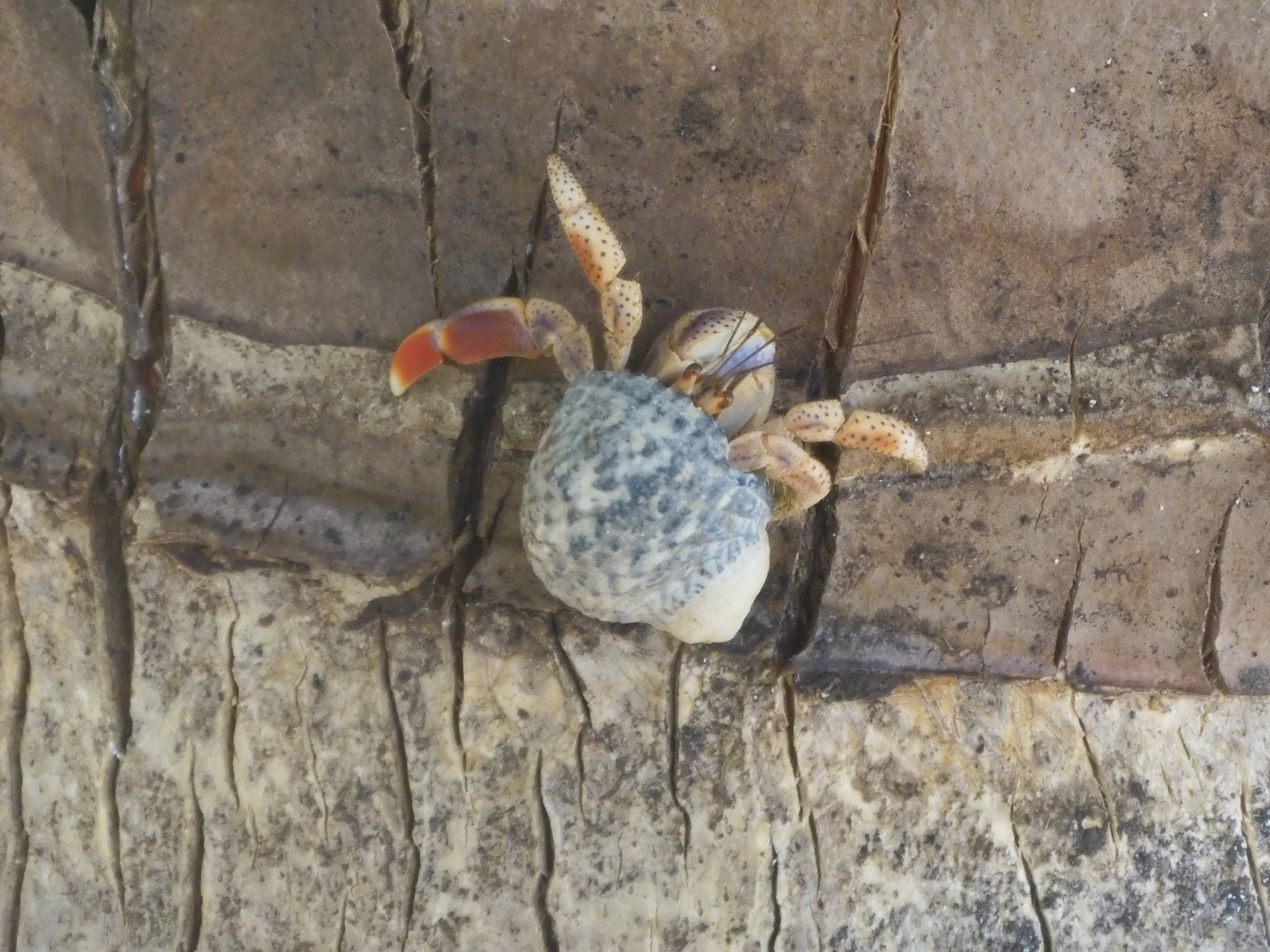 Hermit crabs are the primary reason almost all coconuts found on the ground in Sandy Island have holes in them and are eaten out. It is remarkable that they can tear through the thick outer hull and into the coconut inside. No doubt, the coconut water, in addition to the meat, provides additional motivation for the crabs, especially during the dry season.