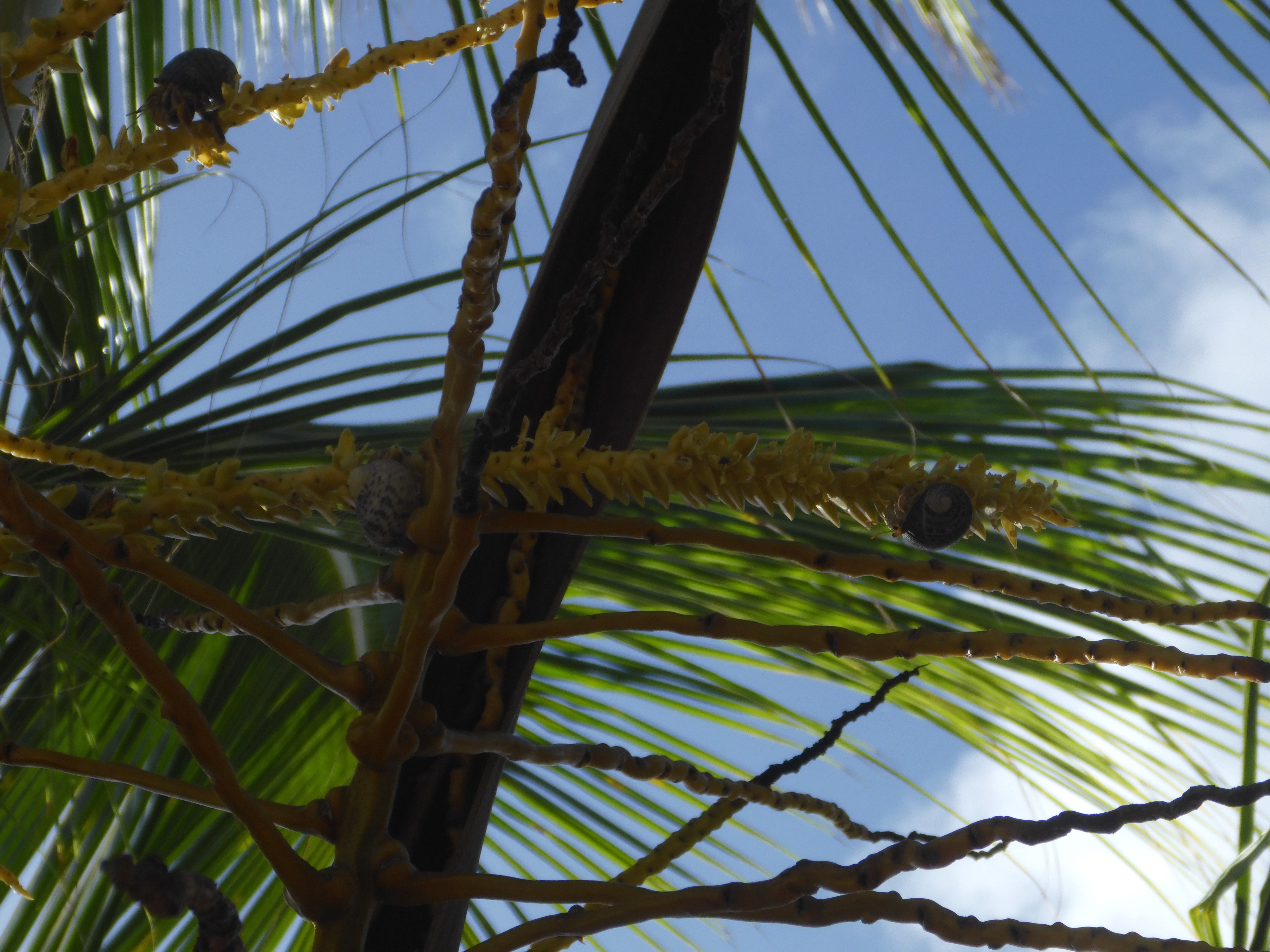 First, let us confirm that there are many hermit crabs in the coconut trees. Once we started looking we found them climbing the trees and eating the coconut flowers, as well as the immature coconuts.