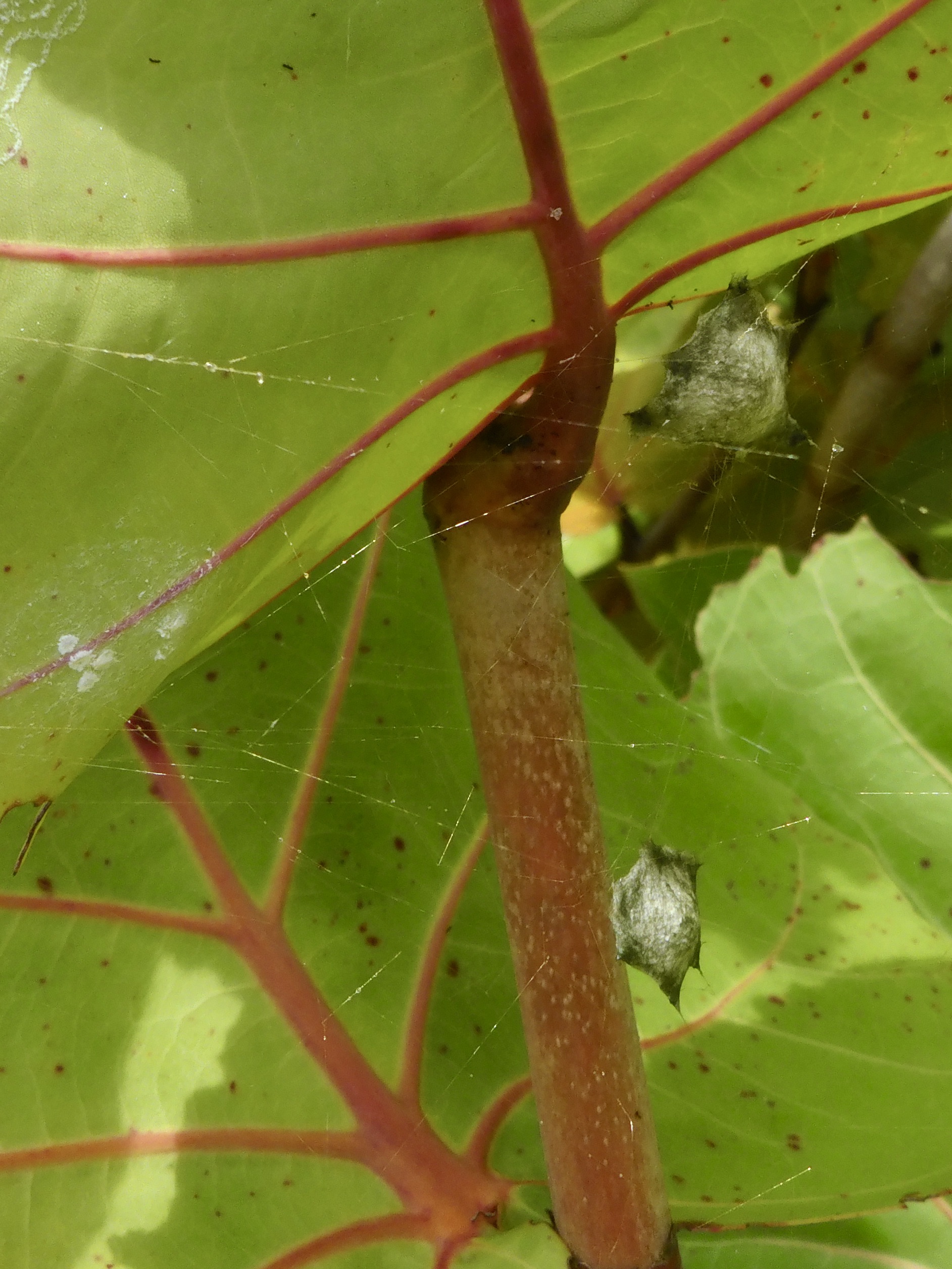 While examining the sea grapes for hermit crab activity we spotted several beautiful spiders (Yellow and Black Garden Spiders) and what we believed to be egg casings.