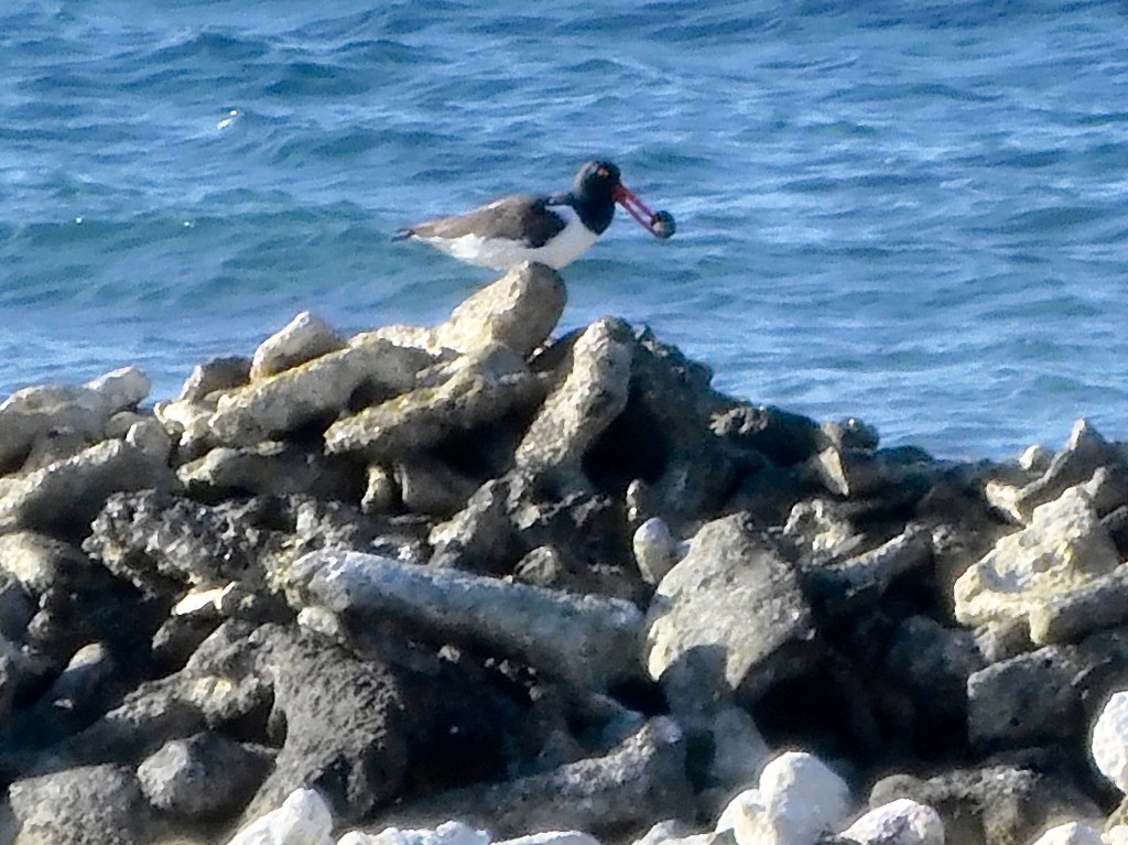 We visited Duhkxyland for the first time since 2019, when this destination served as Duhkxy’s imaginary personal beach. As dogs often do, he perked up as we approached and gleefully swam ashore to re-acquaint himself. While visiting, I caught a glimpse of bright red and immediately recognized a pair of the distinctive American Oystercatchers.