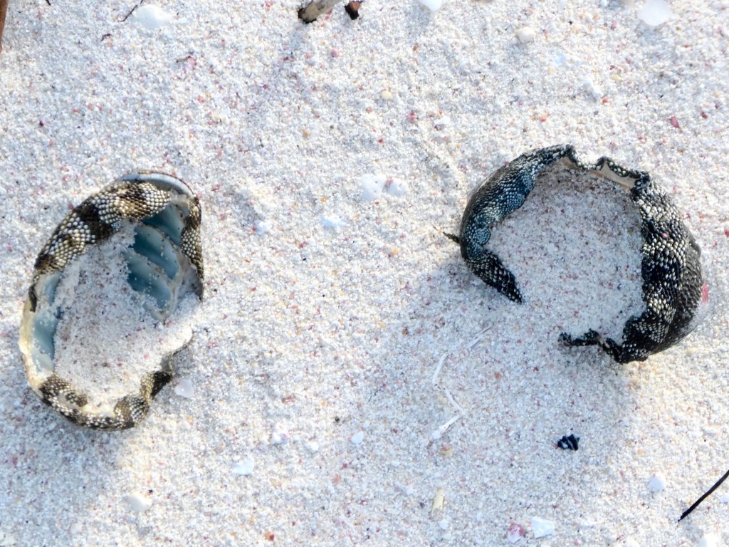 The island’s hermit crabs that had almost entirely moved underground when we left Sandy Island last June, were now more apparent; but nowhere near the population seen previously. Duhkxy was delighted to find that the white ghost crabs that build burrows at the water’s edge remained plentiful.