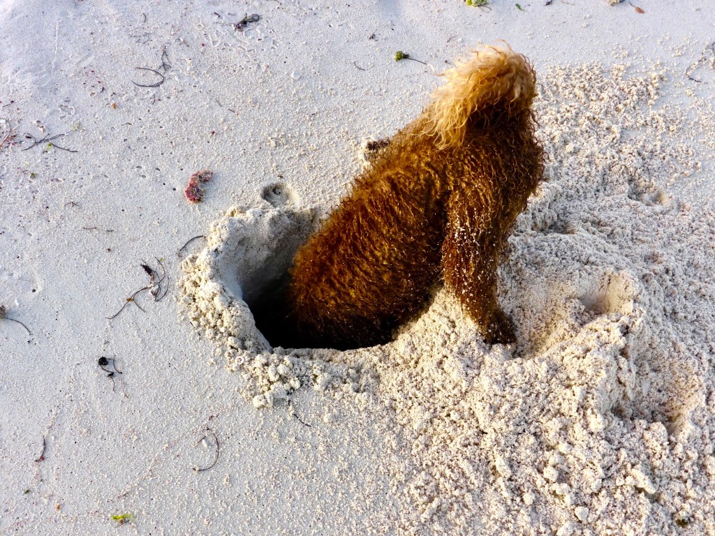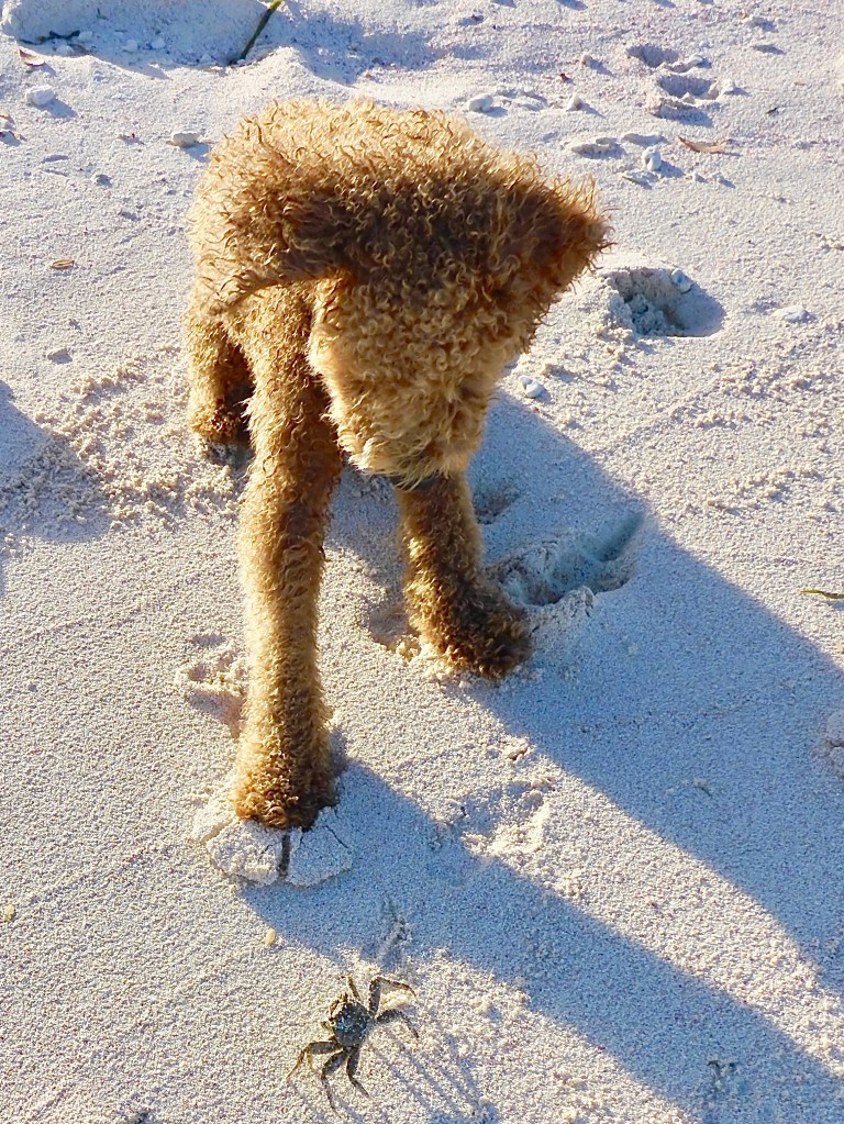 He has become more persistent and accomplished in his pursuit of them. Guided by smell, he digs following the tunnel entrance until he unearths the crab. When he gets one out, he delights in chasing them. His play is invariably brief as they are amazingly fast and nearly invisible when they stop moving. In addition, they head for the water and can bury themselves in the sand within a second in wet sand. On occasion, one takes a stand, refusing to move. Duhkxy will bark and howl in dismay which translates to “Cmon, play with me.”
