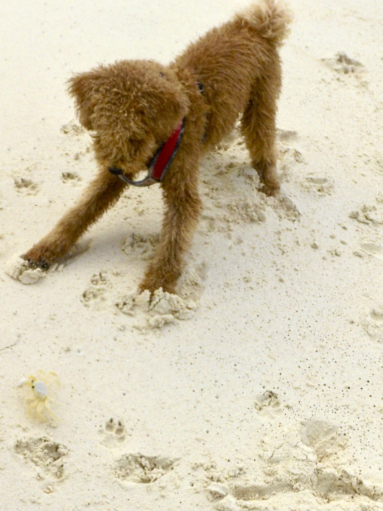 Once Duhkxy hits a beach, he is digging up and chasing ghost crabs. They are nearly invisible on the sand if they remain still. After unearthing them, he LOVES to chase them and he will bark and prance around them if they don’t run.