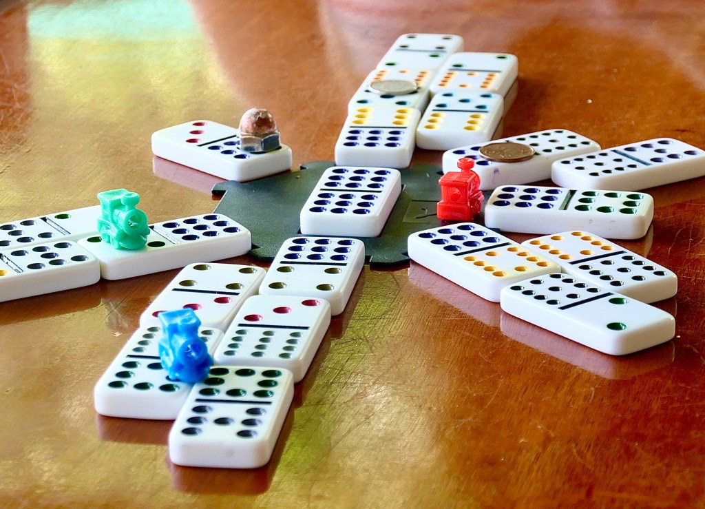 One of the best consequences of living here for more than a year has been our growing friendship with a French Canadian couple, Sophie and Richard. They introduced us to Train Dominoes and we play with them and many other devotees as much as possible. It combines the elements of chance and skill such that even a novice may sometimes do well.