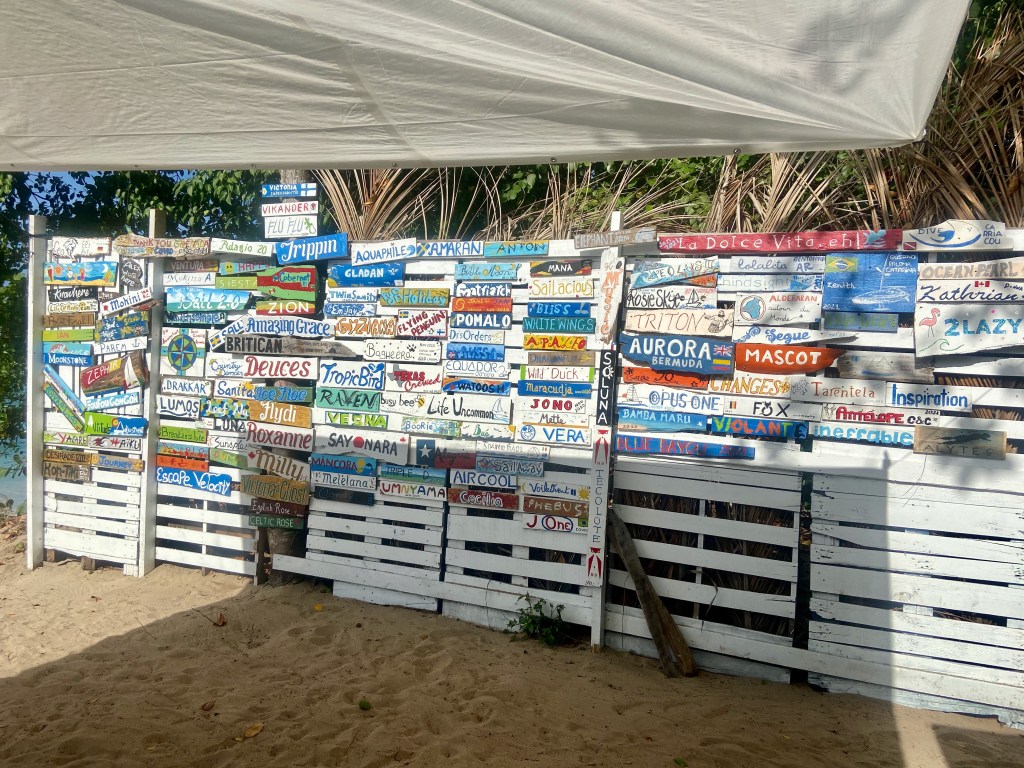 We watched a lovely gesture started by Allison at Paradise Beach Club in creating a row of signs depicting boat names for her dedicated customers during lockdown, expand subsequently into a decorative wall documenting the many boats passing through. Sailors are invited on Wednesdays for Allison’s trademark “Sip and Paint”. Allison supplies the wood and the paint.