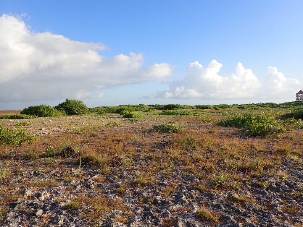 Between the coasts the coral rock supports an array of plant species with a palette of oranges, greens and browns, as well as lizards and hermit crabs.