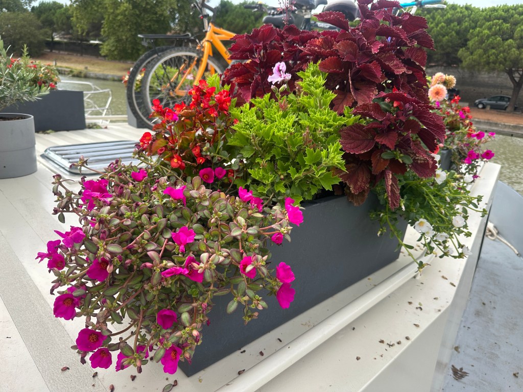 Our joy in seeing canal boats decked out with flowers made it a priority to install them asap. They included lots of flowering plants, as well as basil, mint, chives, parsley, and cilantro. We had no insect issues and everything grew beautifully. Note to all, however, plant your mint in its own container – it is very aggressive.
