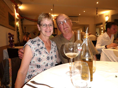 We enjoyed one of the best dinners of our trip at a restaurant Mitch and Marilla picked out. Fabulous duck, carpaccio de boeuf… We had previously dropped off a cake for a belated (Mitch) and early (Marilla) birthday celebration. Sadly, Riley was not feeling well and she and Allison left early to get a good nights sleep so we took the cake back to the boat and saved some for Riley.
