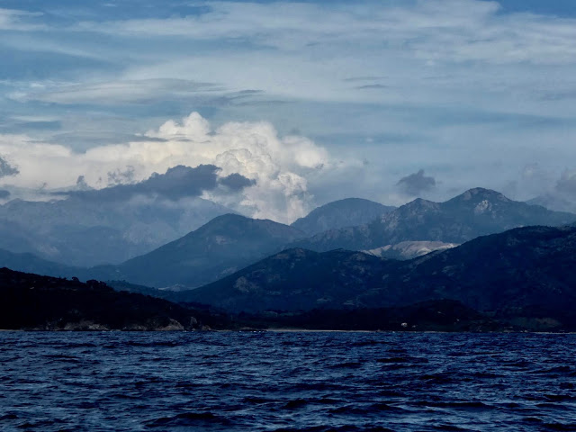 Along the way, the winds picked up to 25 knots with gusts up to 30 knots and consistent 5-6 foot waves amid “confused seas”. You may recall, when we sailed in the English Channel from Cherbourg to Le Havre, we described that there was no pattern to the waves that assailed us from multiple directions. As such, waves will periodically merge with one or more waves and with little warning, you can get a really big wave. This is referred to as “confused seas” and this type of disruption in wave pattern arises when tidal changes / current clashes with wind; when waves reflect back off land masses; when there are leftover waves from winds in a previous direction; and likely lots of other factors. Our experience in the Mediterranean is they are pretty much the norm unless it is dead calm.