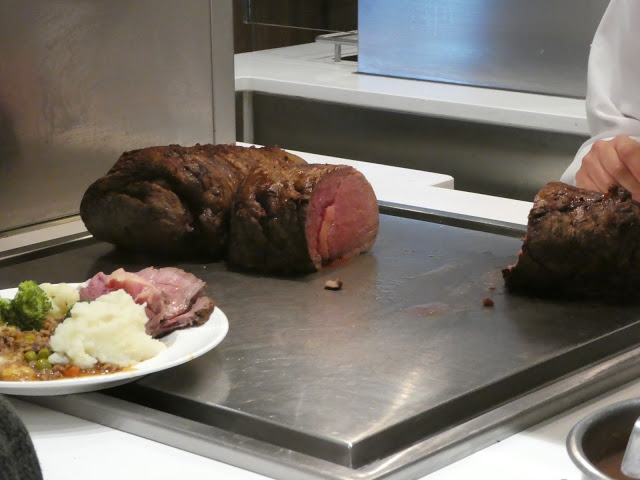 There is a large self-serve dining area (The King’s Court) that is open nearly around the clock offering breakfast, lunch, dinner, as well as, endless confections. High and low tables for two, four, and larger groups are set with placemats, linen napkins and silverware. The food in this court is also different every day and very good. For example, we have feasted on exquisite rack of lamb, shrimp dishes, sushi, roasted vegetables, salads, fresh and smoked fish, and stir fry.