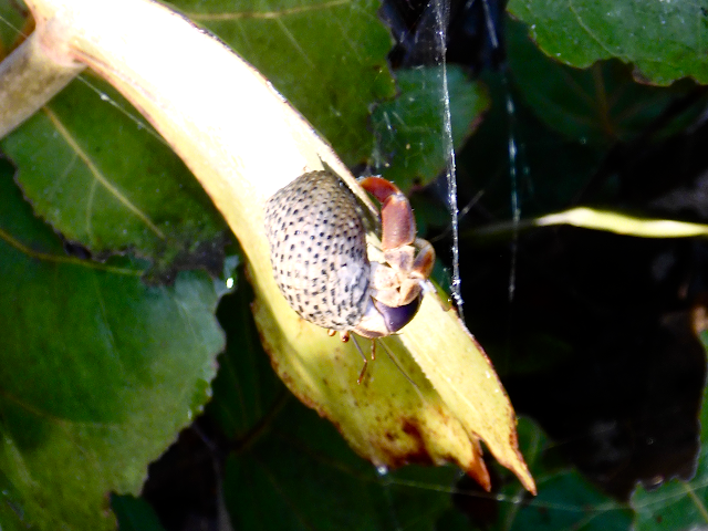 While examining the sea grapes for hermit crab activity we spotted several beautiful spiders (Yellow and Black Garden Spiders) and what we believed to be egg casings.