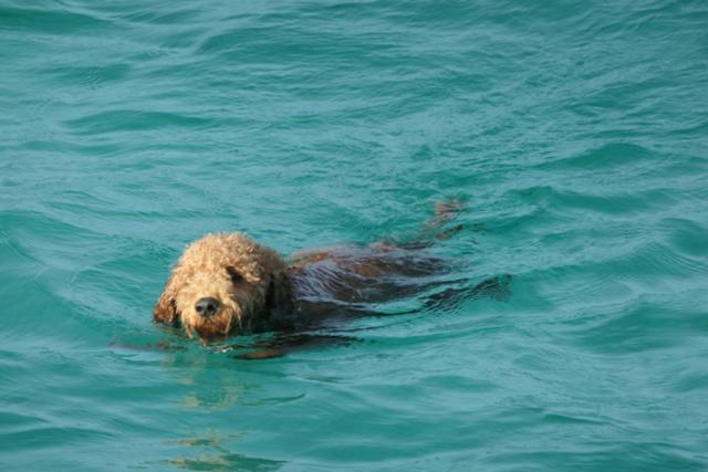 In an effort to establish a new routine for play we put out a ramp for Duhkxy off the swim platform. Once we jumped in he was happy to join us but he headed immediately for shore, took a poop, and then swam back to the boat.