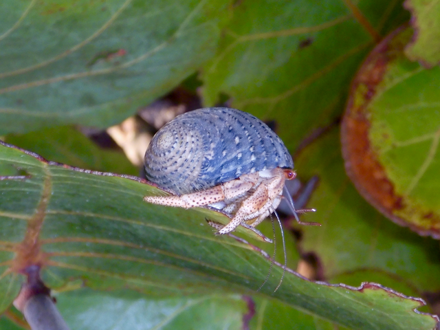 Later we found them climbing palm trees and congregating and feasting on the foliage of the sea grape. The following photos are representative of the majority of the hermit crabs we encountered.