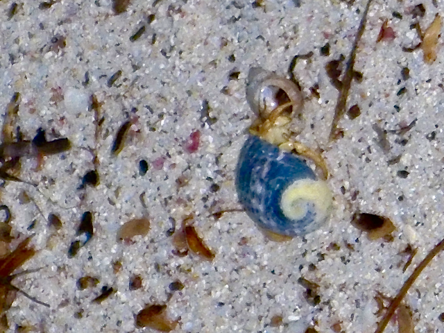 Hermit crabs are remarkable creatures. They do not have a protective shell covering their abdomens. They must borrow one left behind by a dead snail or other animal. Having searched the beach on Sandy Island for months, I can attest to the fact that there are not many shells and the most beautiful ones invariably have been taken by a hermit crab. As they grow, they must find larger shells and on occasion they may do so in a cooperative manner.